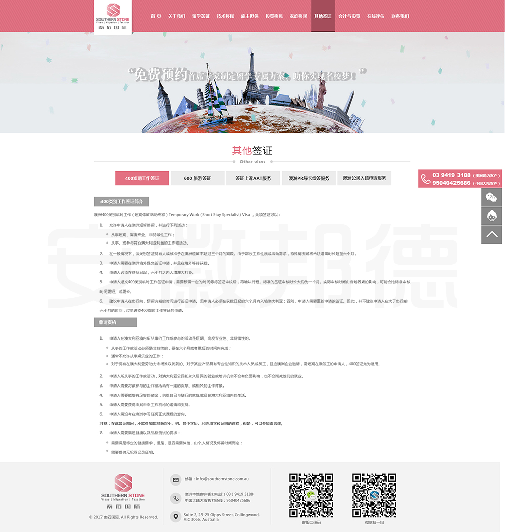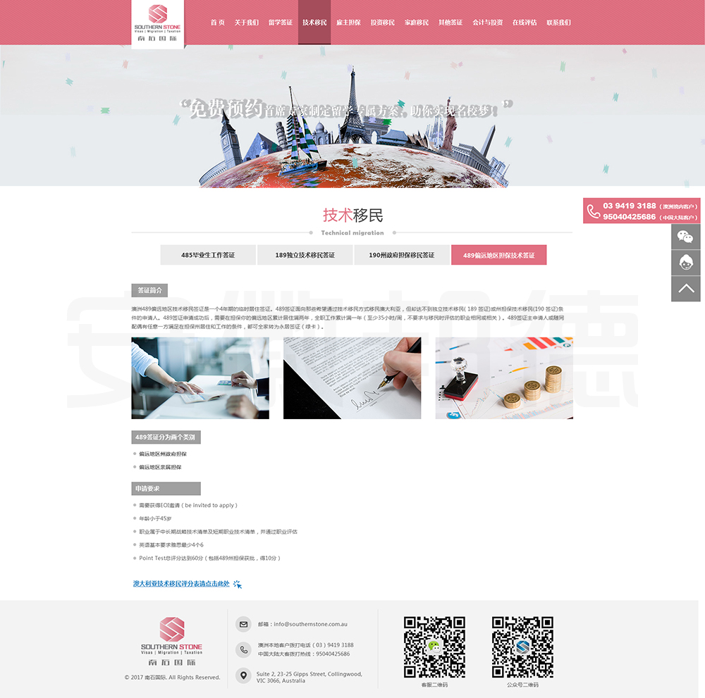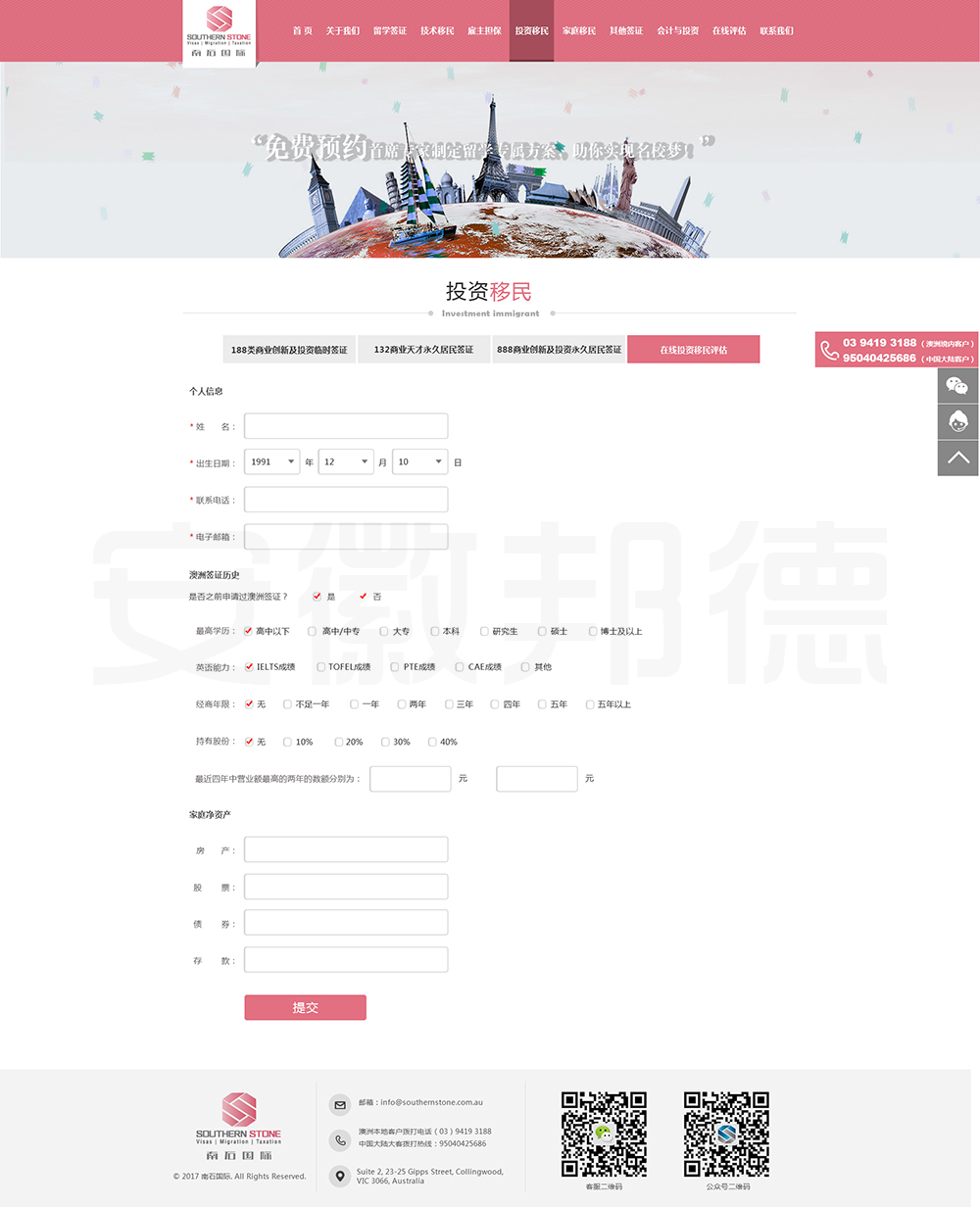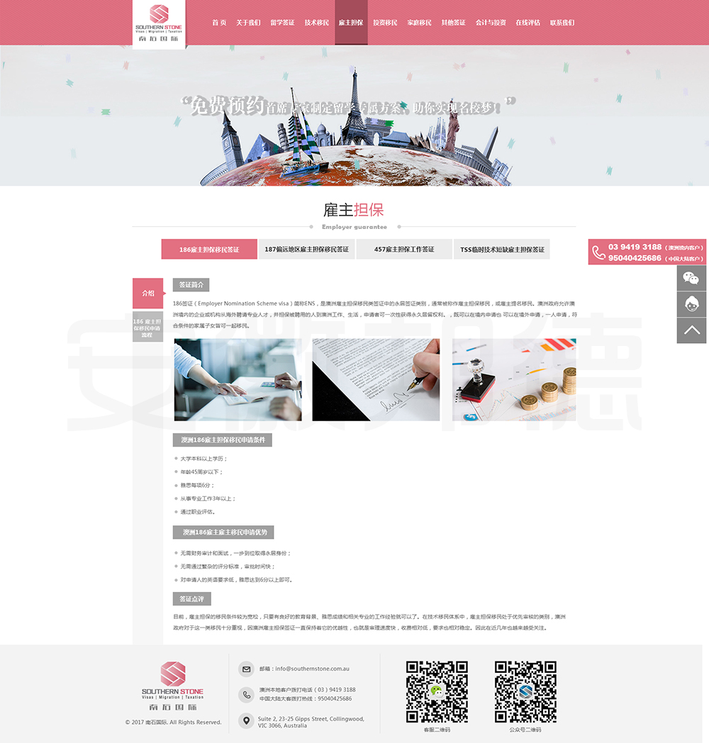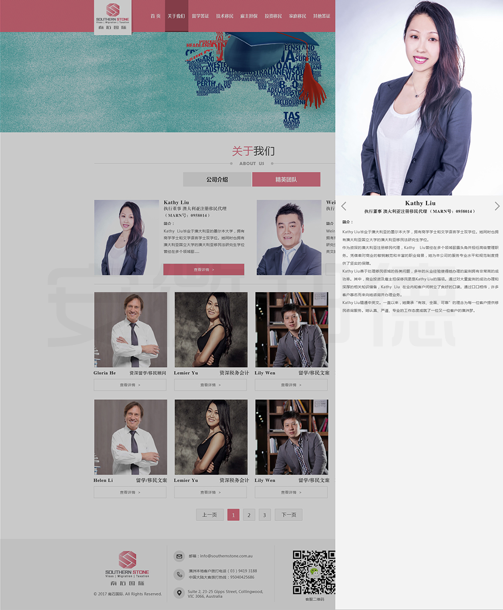 南石国际有限责任公司是一家经澳大利亚政府批准,在移民代理注册管理部门(OFFICE OF THE MARA)备案注册的移民咨询公司。我们的团队由专业的移民代理、留学教育代理、投资理财专家和从业经验丰富的员工组成。澳大利亚移民法条款繁多,内容复杂且瞬息万变;我们的团队严格遵守职业行为守则,时刻关注澳洲移民政策的最新动态,针对每一位客户的特点和要求量体裁衣,提供最便捷、最准备、最及时的签证和移民方案。邦德开发为客户提供网站效果图设计,