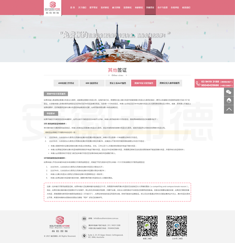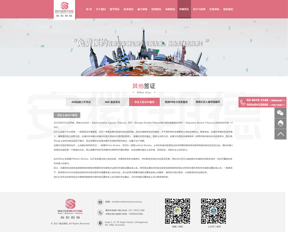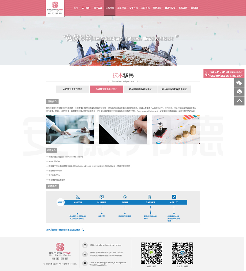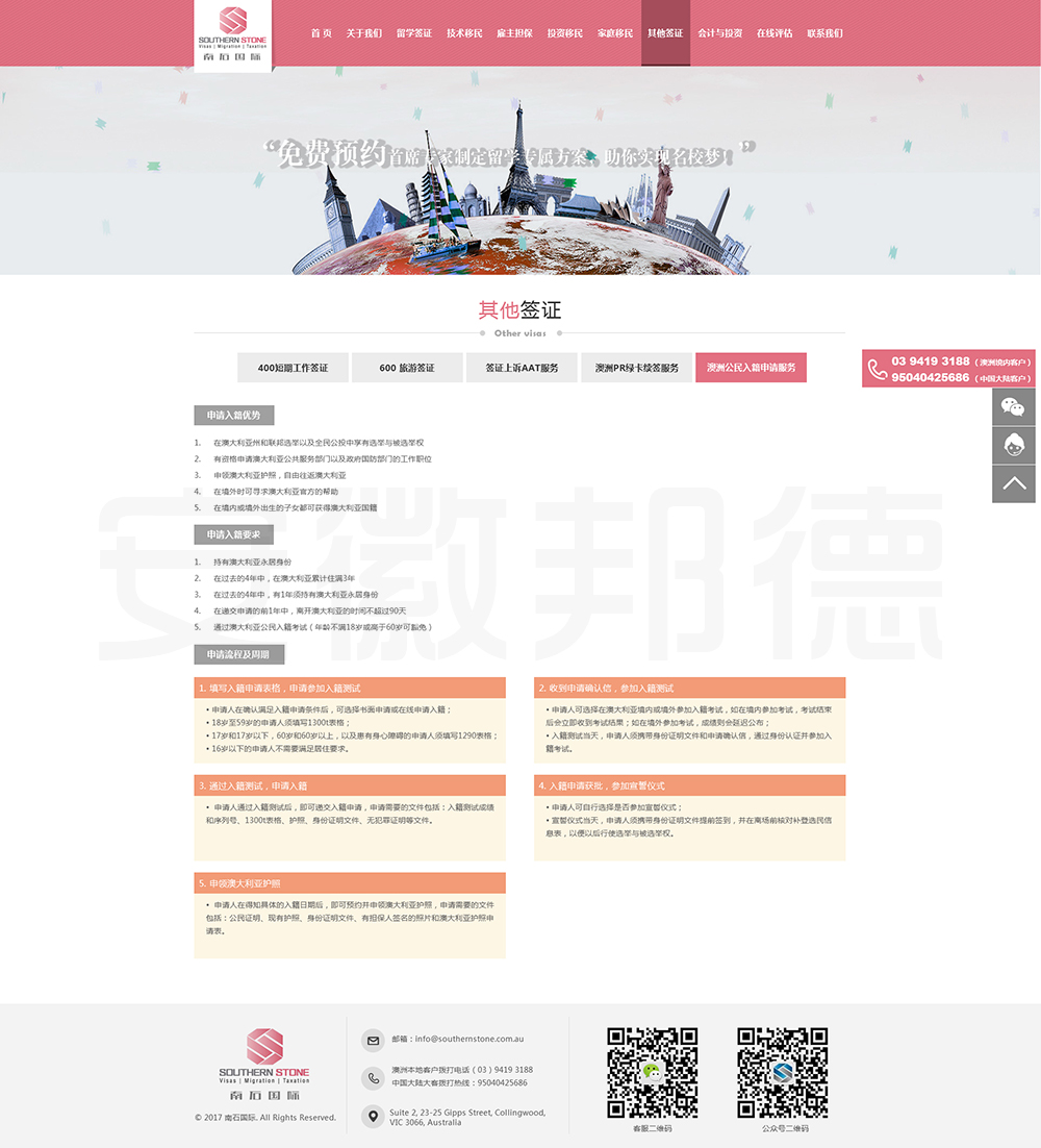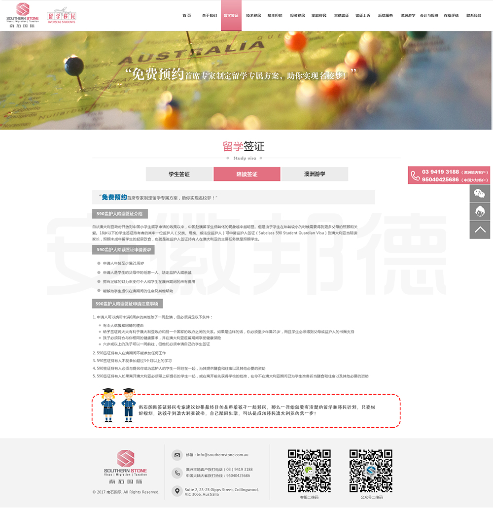 南石国际有限责任公司是一家经澳大利亚政府批准,在移民代理注册管理部门(OFFICE OF THE MARA)备案注册的移民咨询公司。我们的团队由专业的移民代理、留学教育代理、投资理财专家和从业经验丰富的员工组成。澳大利亚移民法条款繁多,内容复杂且瞬息万变;我们的团队严格遵守职业行为守则,时刻关注澳洲移民政策的最新动态,针对每一位客户的特点和要求量体裁衣,提供最便捷、最准备、最及时的签证和移民方案。邦德开发为客户提供网站效果图设计,