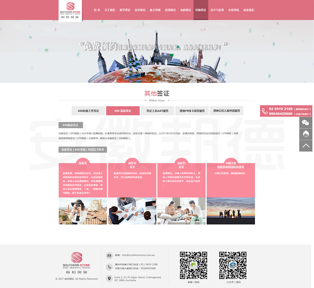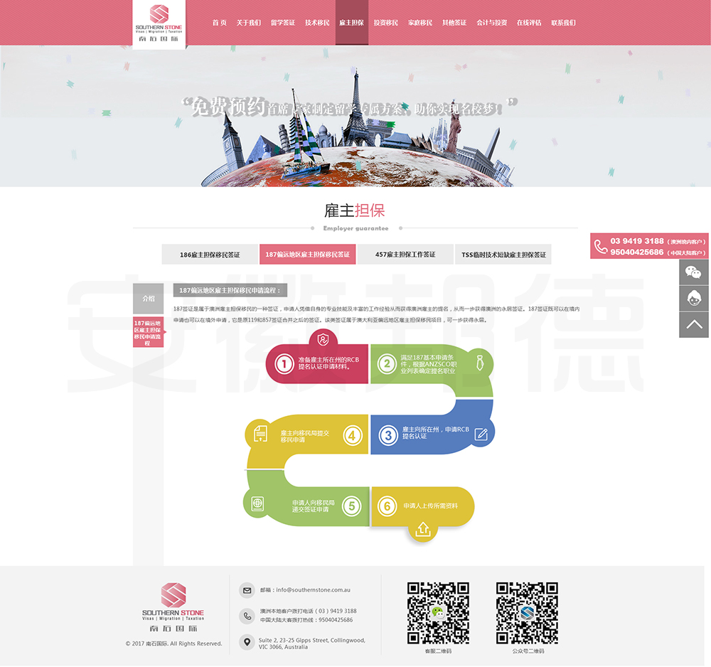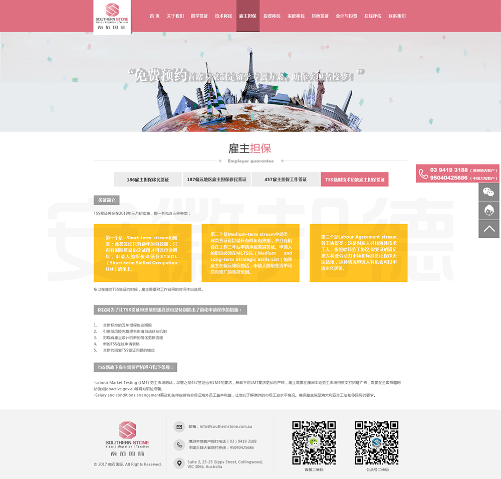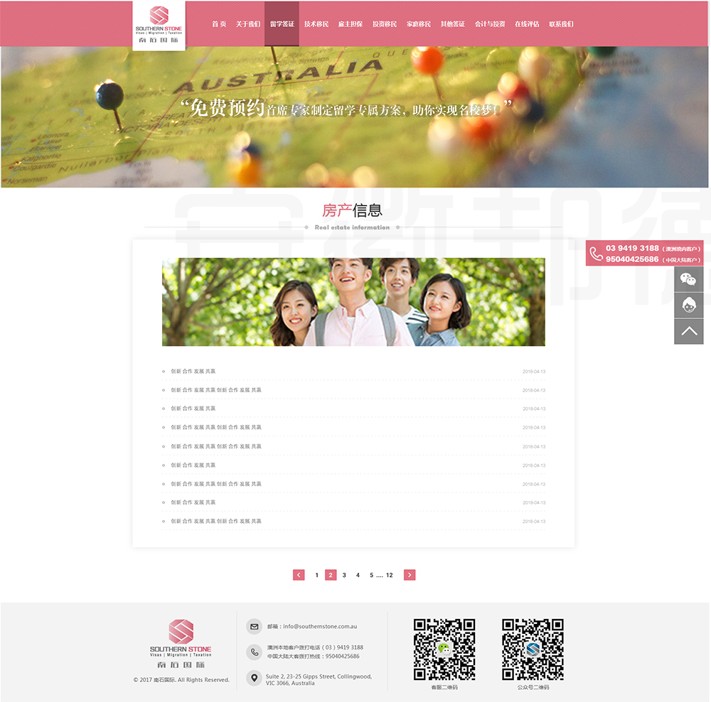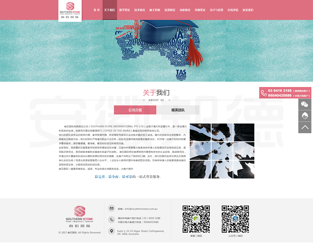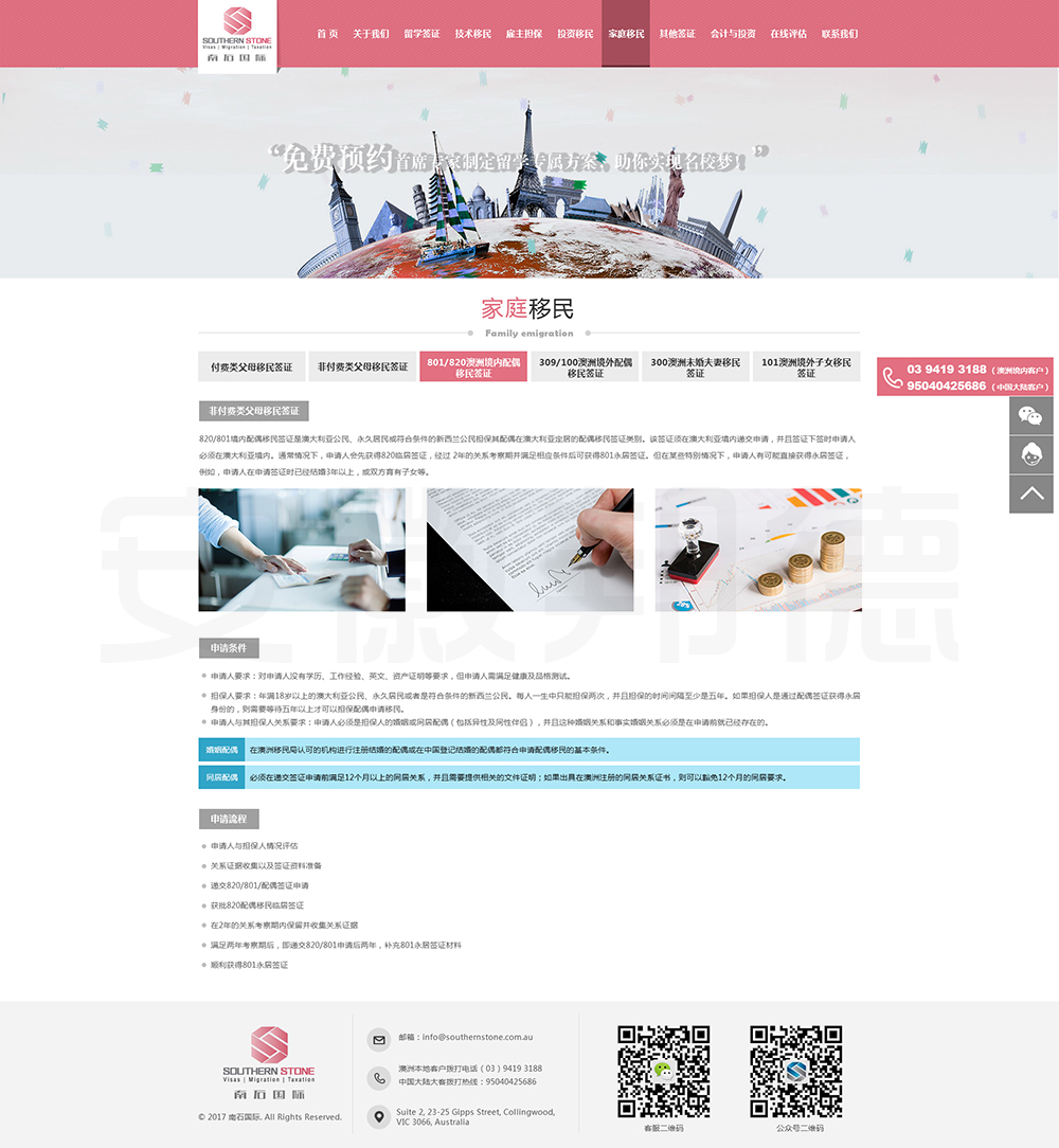 南石国际有限责任公司是一家经澳大利亚政府批准,在移民代理注册管理部门(OFFICE OF THE MARA)备案注册的移民咨询公司。我们的团队由专业的移民代理、留学教育代理、投资理财专家和从业经验丰富的员工组成。澳大利亚移民法条款繁多,内容复杂且瞬息万变;我们的团队严格遵守职业行为守则,时刻关注澳洲移民政策的最新动态,针对每一位客户的特点和要求量体裁衣,提供最便捷、最准备、最及时的签证和移民方案。邦德开发为客户提供网站效果图设计,