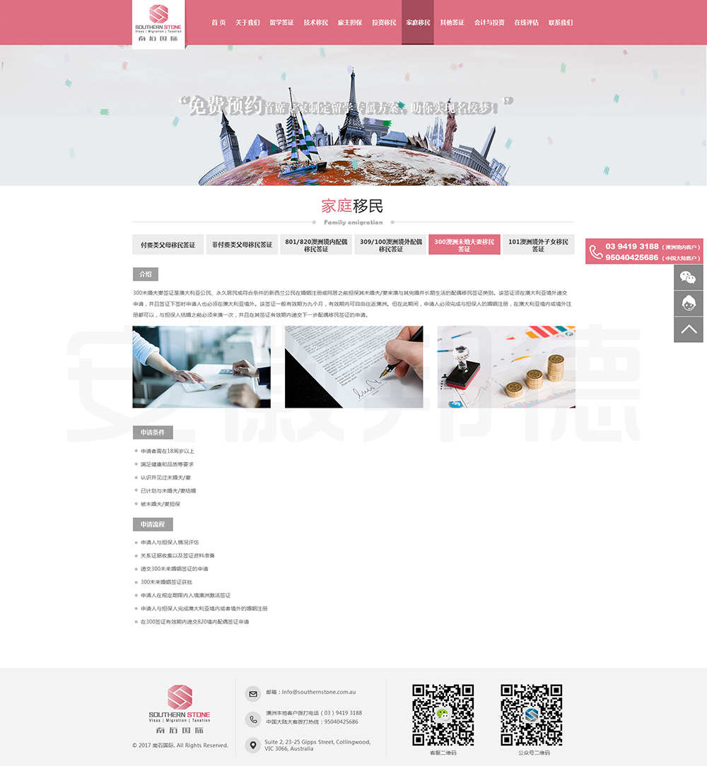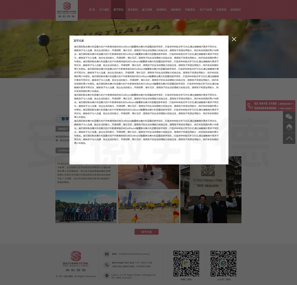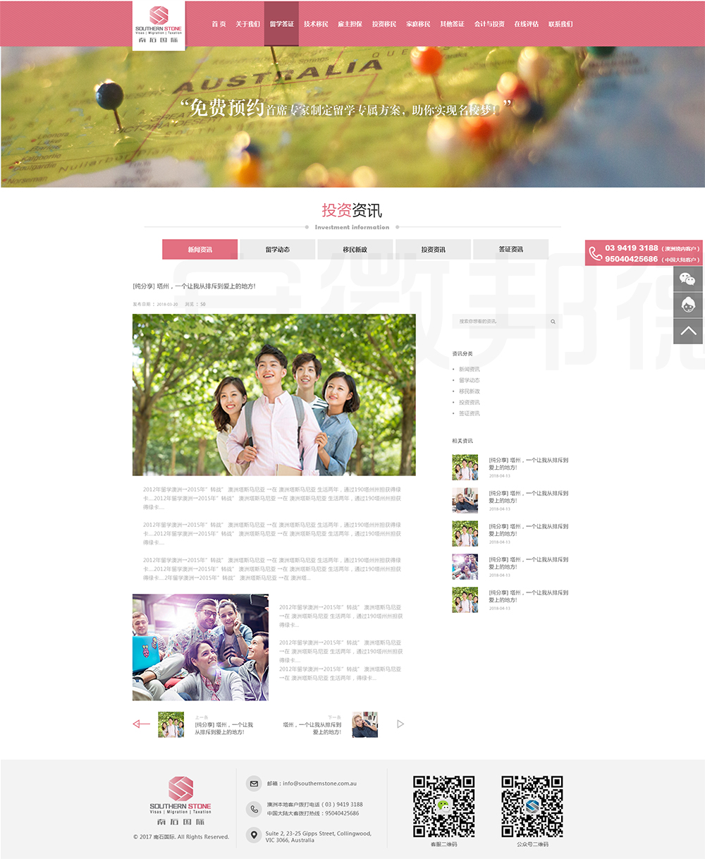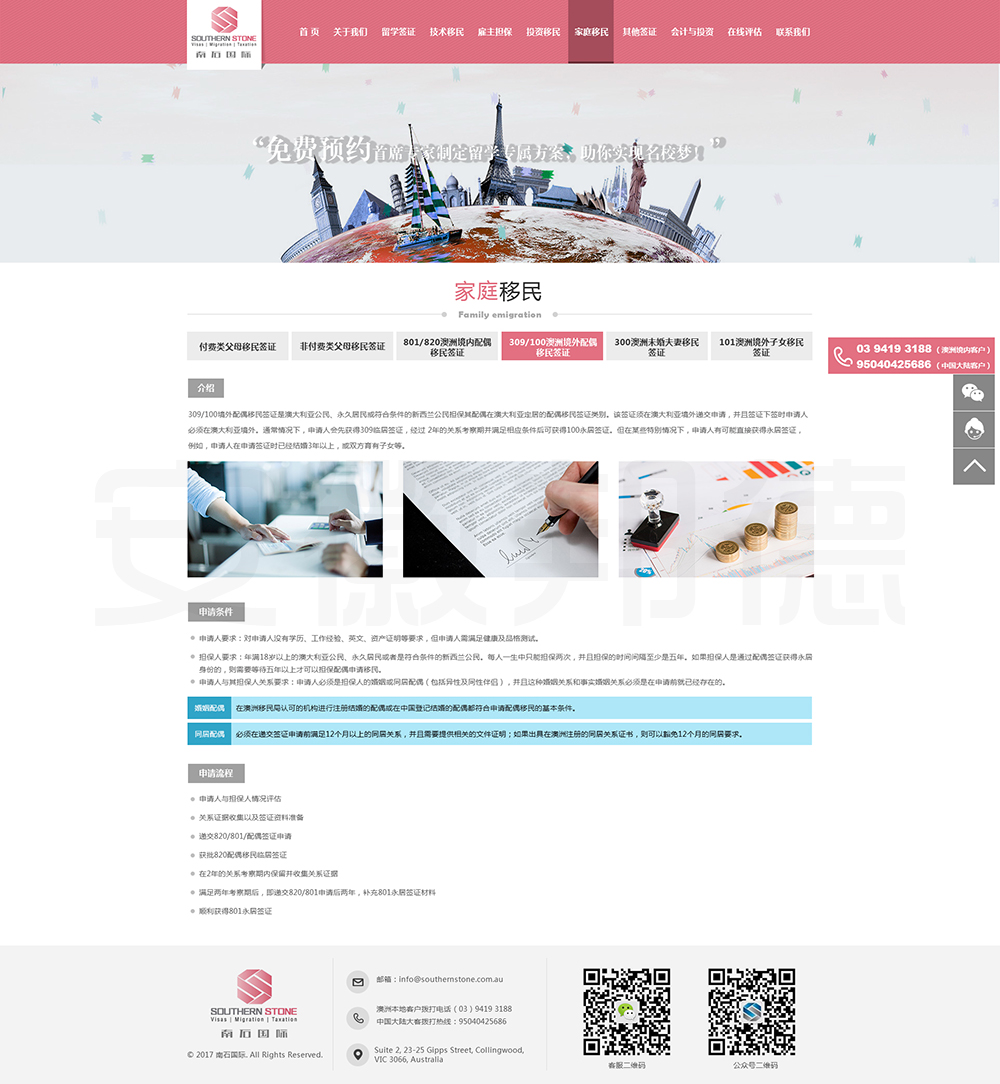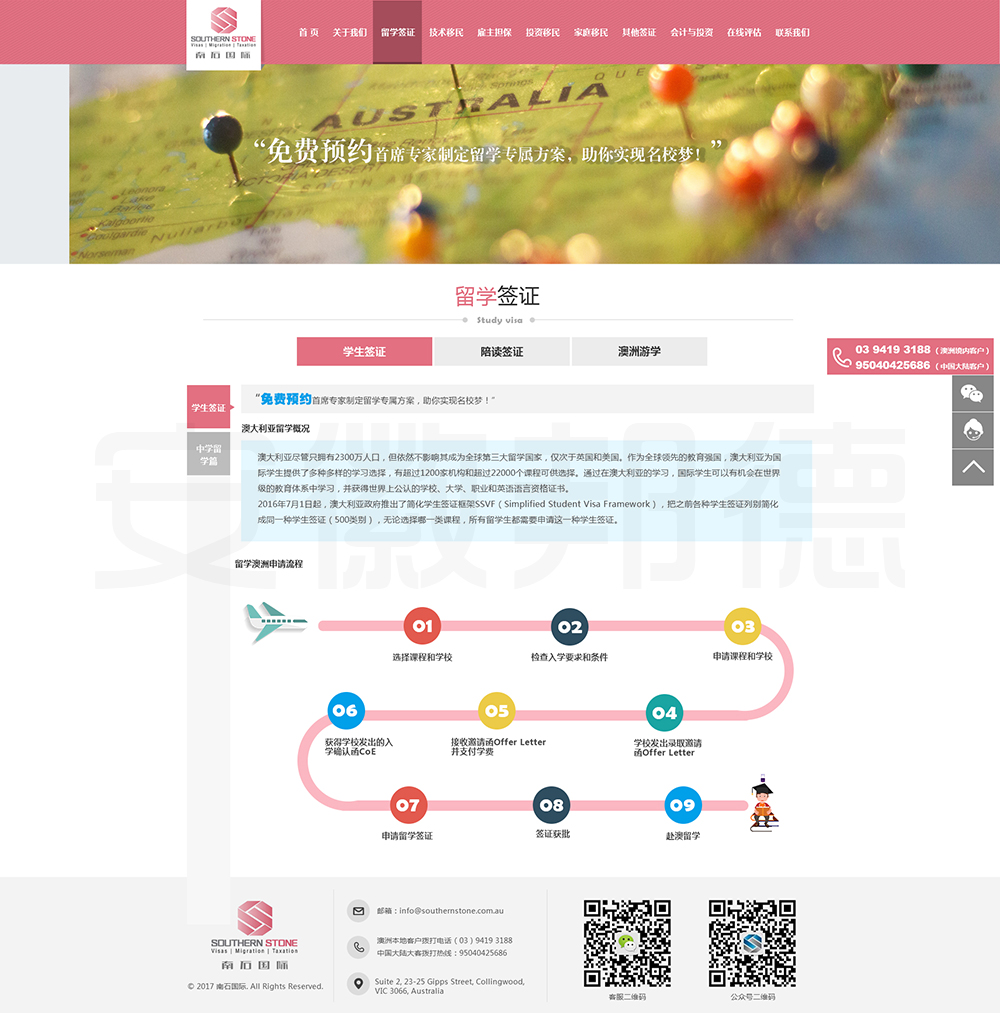 南石国际有限责任公司是一家经澳大利亚政府批准,在移民代理注册管理部门(OFFICE OF THE MARA)备案注册的移民咨询公司。我们的团队由专业的移民代理、留学教育代理、投资理财专家和从业经验丰富的员工组成。澳大利亚移民法条款繁多,内容复杂且瞬息万变;我们的团队严格遵守职业行为守则,时刻关注澳洲移民政策的最新动态,针对每一位客户的特点和要求量体裁衣,提供最便捷、最准备、最及时的签证和移民方案。邦德开发为客户提供网站效果图设计,