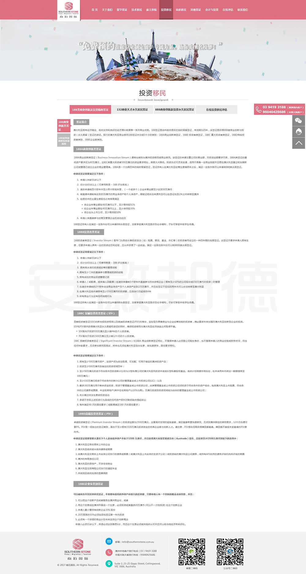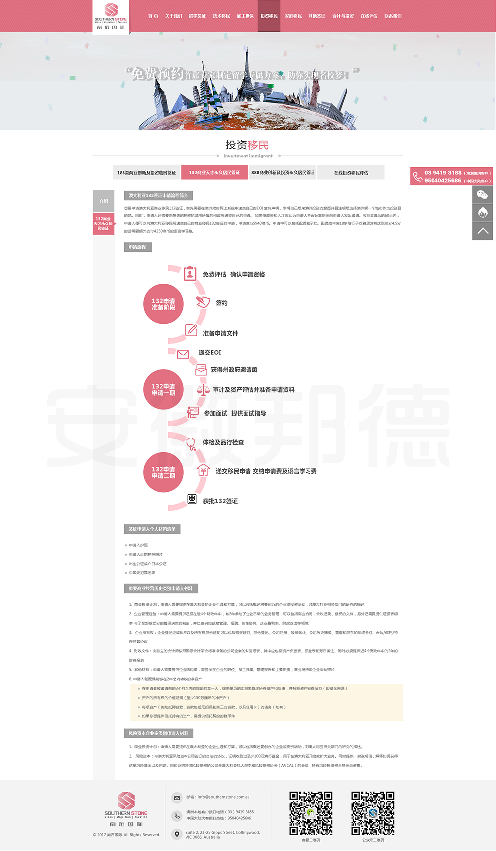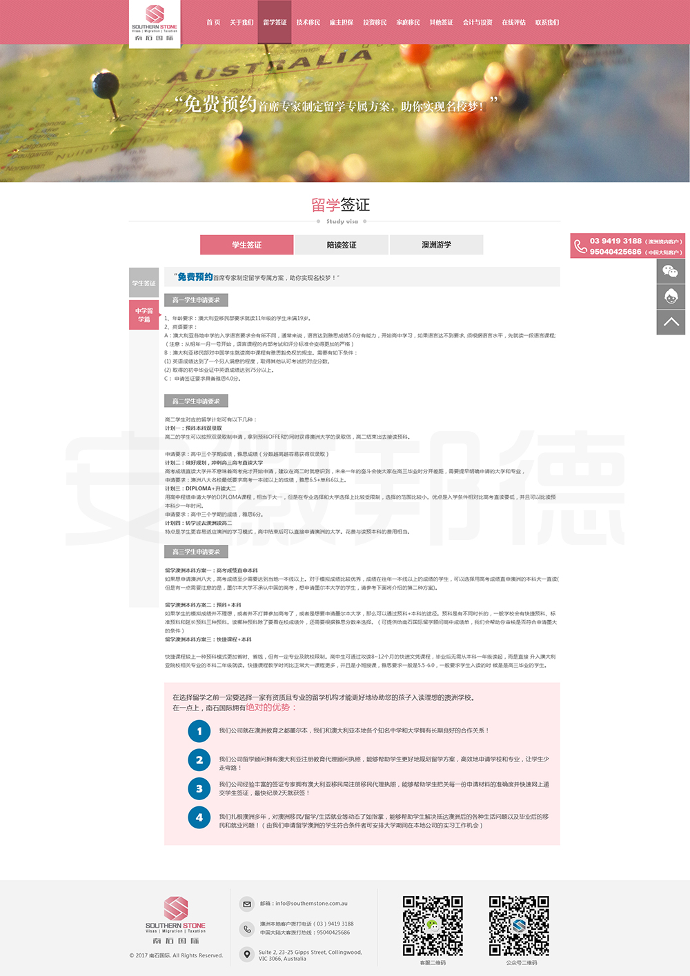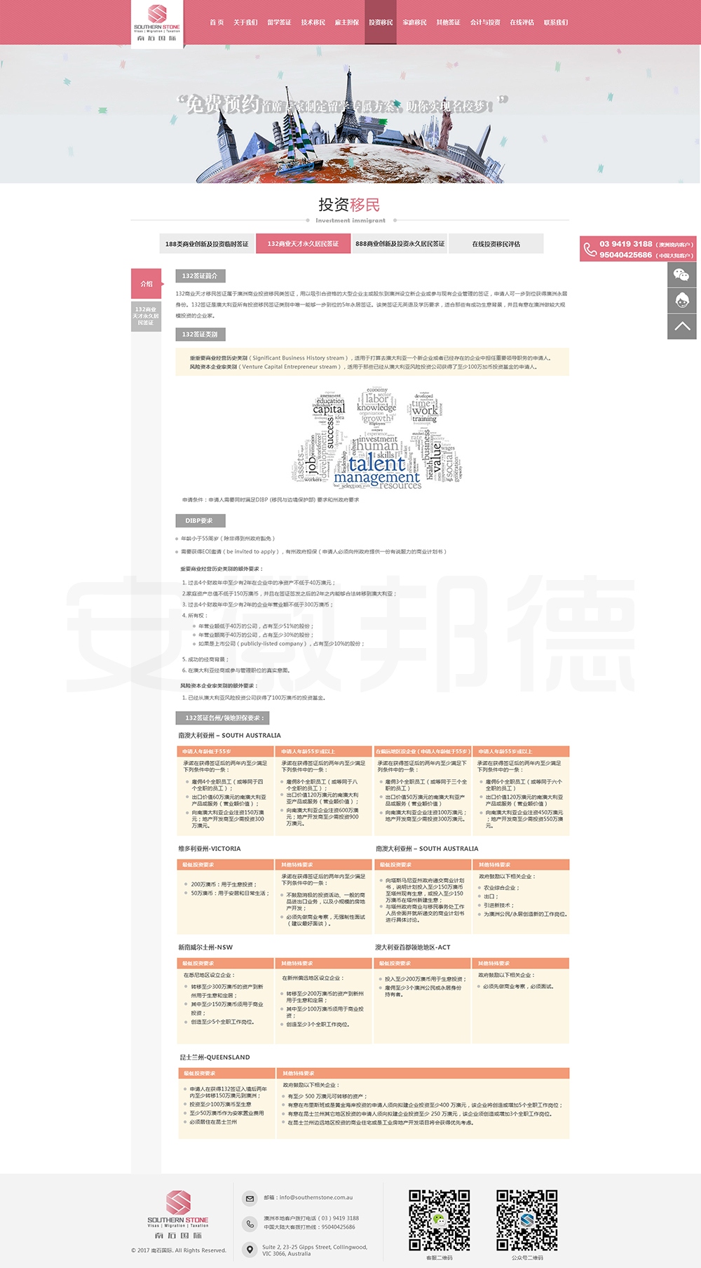 南石国际有限责任公司是一家经澳大利亚政府批准,在移民代理注册管理部门(OFFICE OF THE MARA)备案注册的移民咨询公司。我们的团队由专业的移民代理、留学教育代理、投资理财专家和从业经验丰富的员工组成。澳大利亚移民法条款繁多,内容复杂且瞬息万变;我们的团队严格遵守职业行为守则,时刻关注澳洲移民政策的最新动态,针对每一位客户的特点和要求量体裁衣,提供最便捷、最准备、最及时的签证和移民方案。邦德开发为客户提供网站效果图设计,