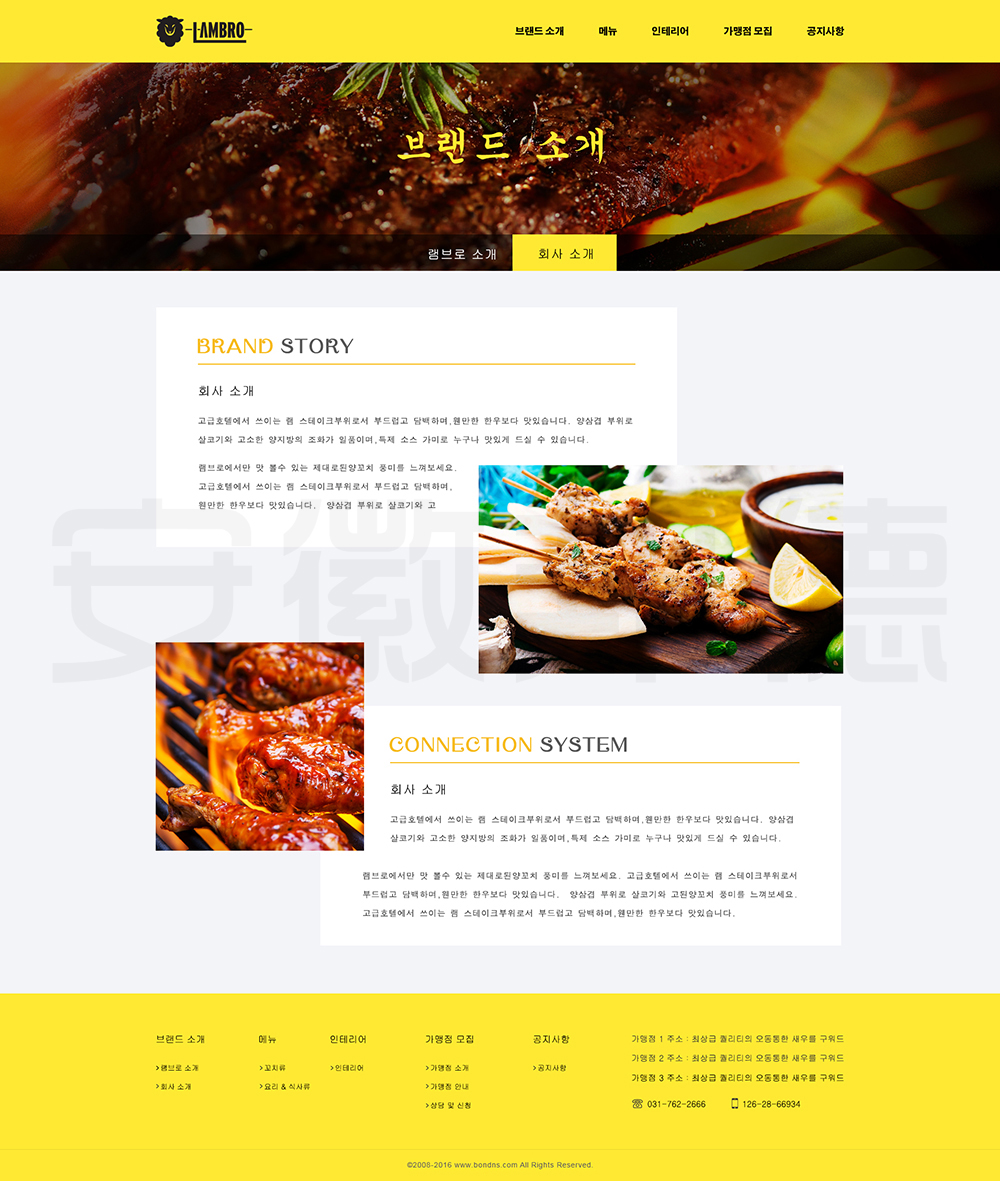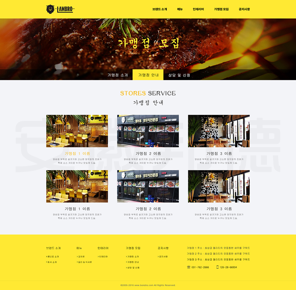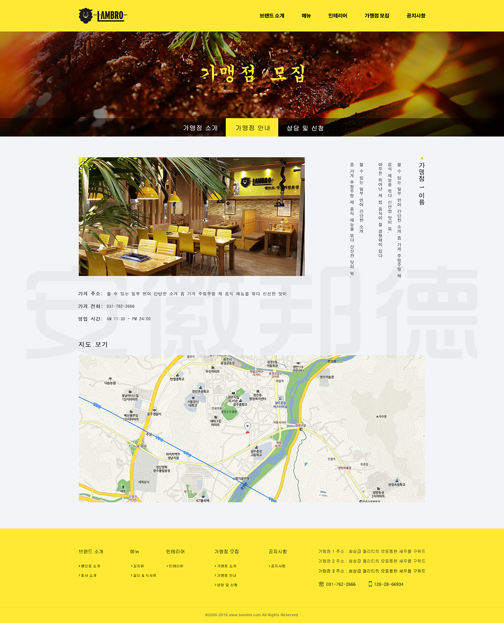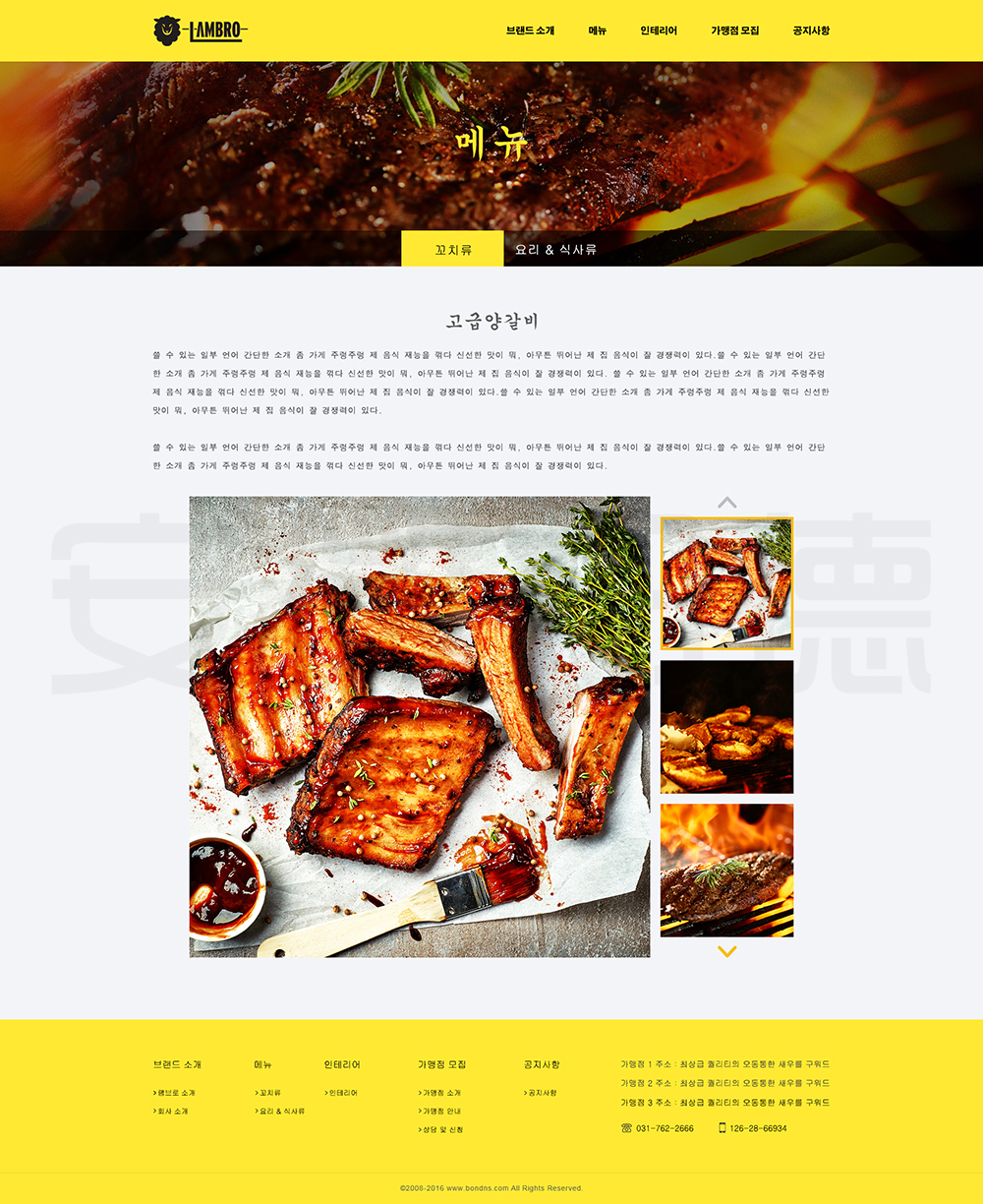 LAMBRO是韩国一家经营烤肉等韩国代表性食物的店铺。邦德开发为客户提供网站效果图设计, HTML5页面设计,程序开发和数据库开发,每位客户均按照需求提供定制设计开发,签订合同,分期付款,并提供完善的售后技术支持,第 一年免费送.com域名和10G(200M带宽)服务器空间。以下网站开发案例效果图我们为了防盗打了水印,网站开发案例均可提供网址和详细功能开发清单,详细内容可以咨询邦德开发客服人员微信!