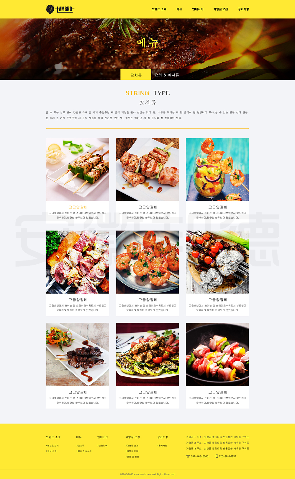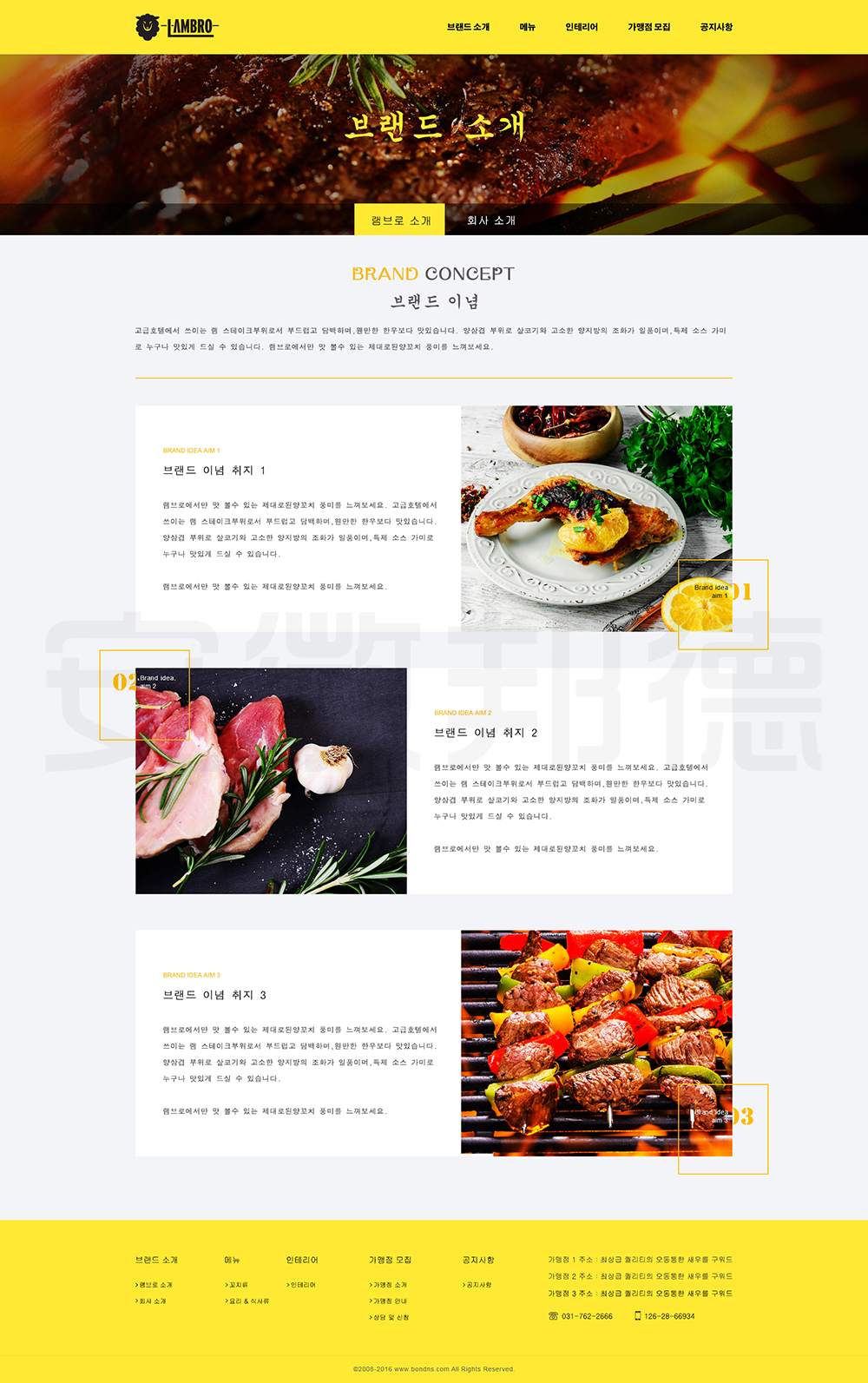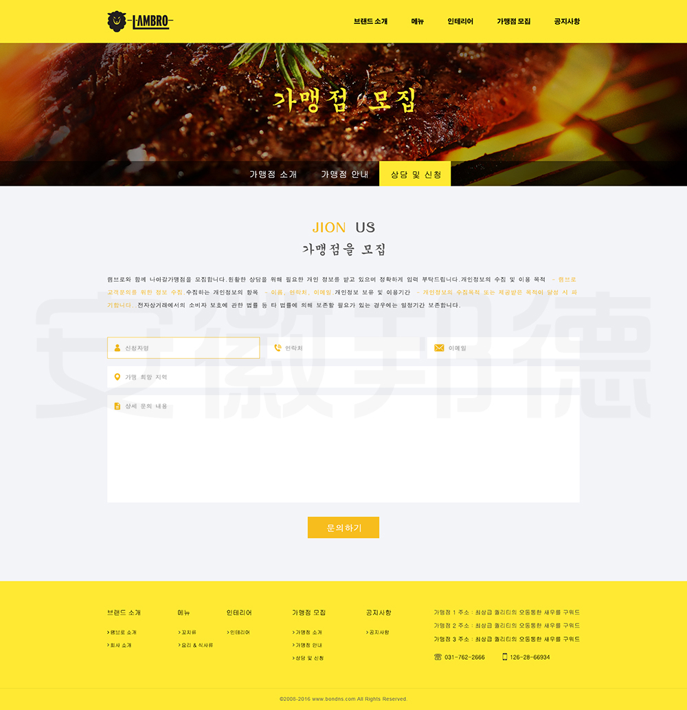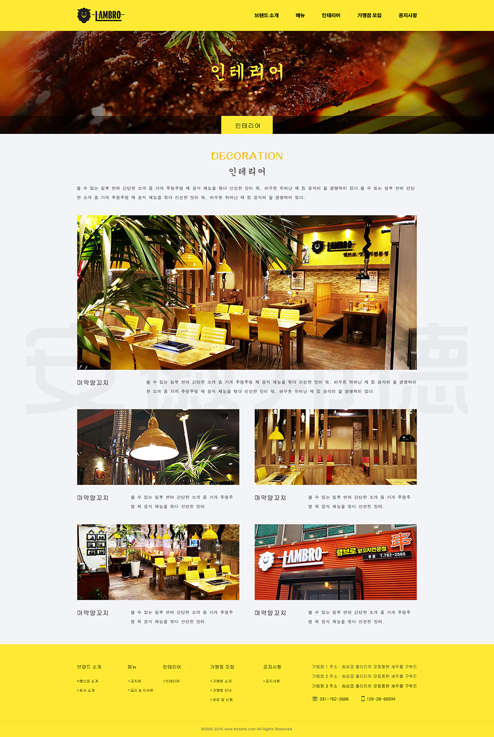 LAMBRO是韩国一家经营烤肉等韩国代表性食物的店铺。邦德开发为客户提供网站效果图设计, HTML5页面设计,程序开发和数据库开发,每位客户均按照需求提供定制设计开发,签订合同,分期付款,并提供完善的售后技术支持,第 一年免费送.com域名和10G(200M带宽)服务器空间。以下网站开发案例效果图我们为了防盗打了水印,网站开发案例均可提供网址和详细功能开发清单,详细内容可以咨询邦德开发客服人员微信!
