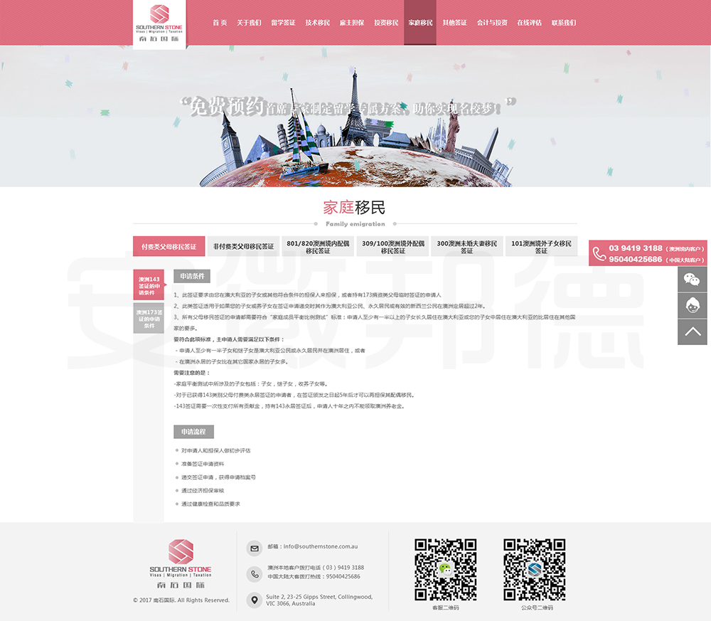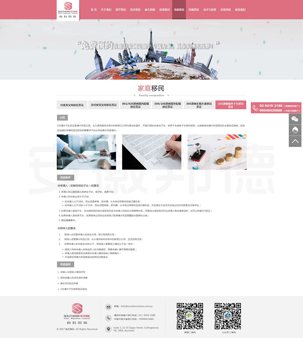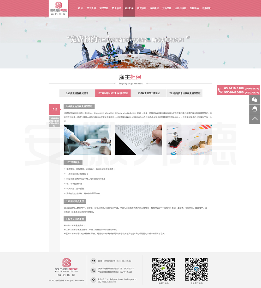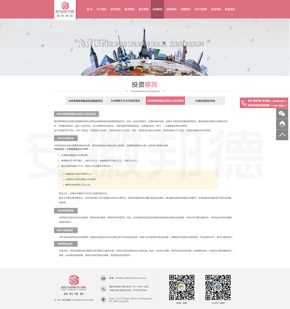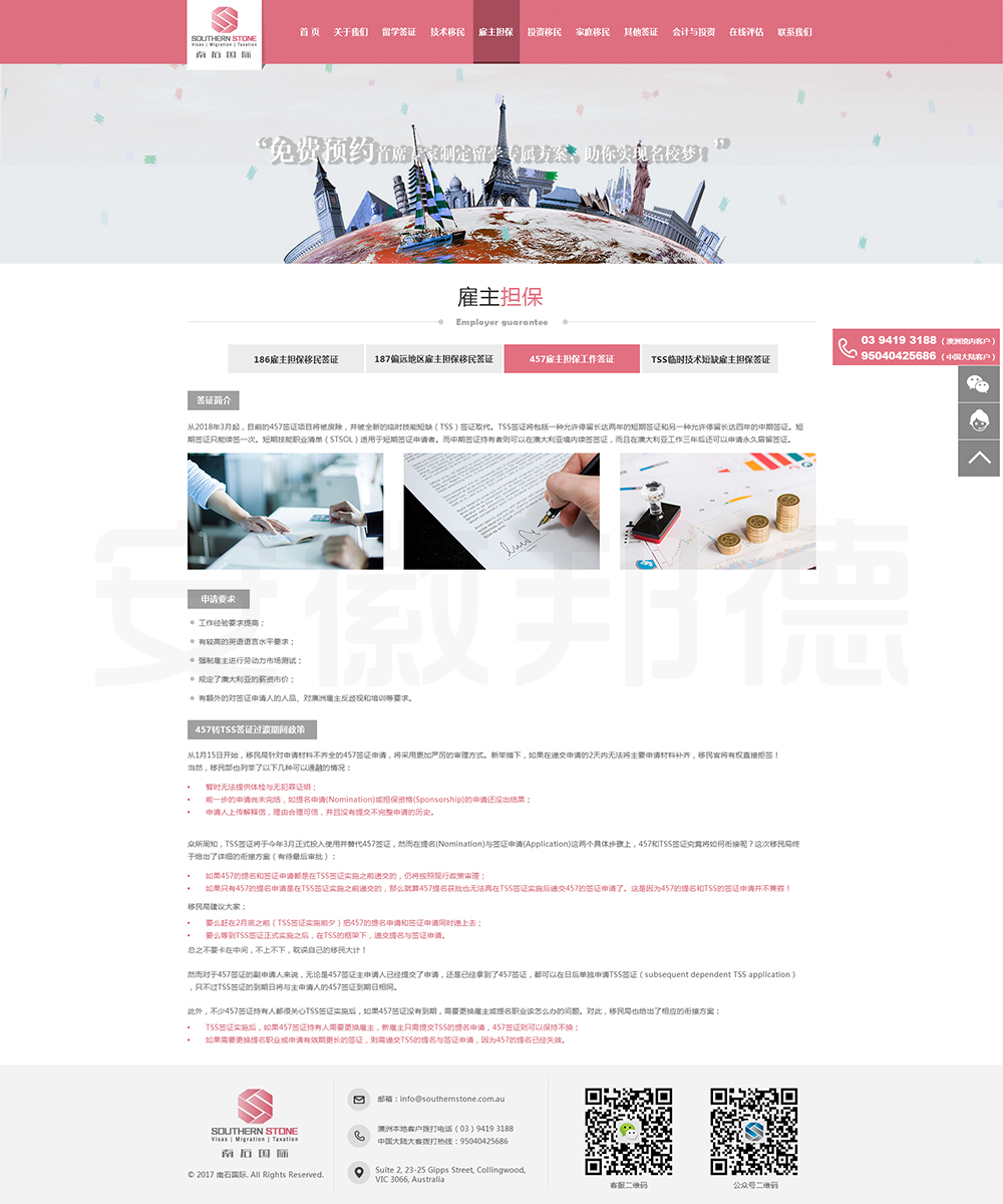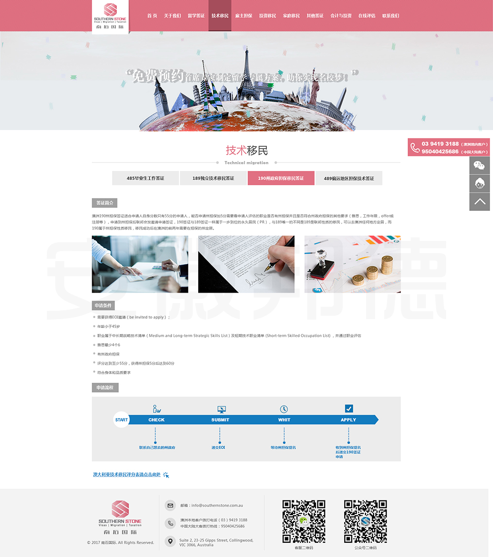 南石国际有限责任公司是一家经澳大利亚政府批准,在移民代理注册管理部门(OFFICE OF THE MARA)备案注册的移民咨询公司。我们的团队由专业的移民代理、留学教育代理、投资理财专家和从业经验丰富的员工组成。澳大利亚移民法条款繁多,内容复杂且瞬息万变;我们的团队严格遵守职业行为守则,时刻关注澳洲移民政策的最新动态,针对每一位客户的特点和要求量体裁衣,提供最便捷、最准备、最及时的签证和移民方案。邦德开发为客户提供网站效果图设计,