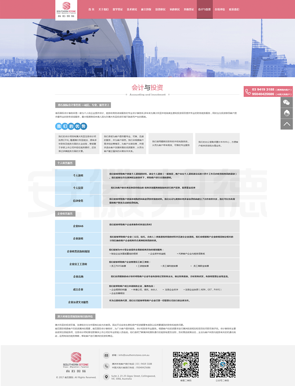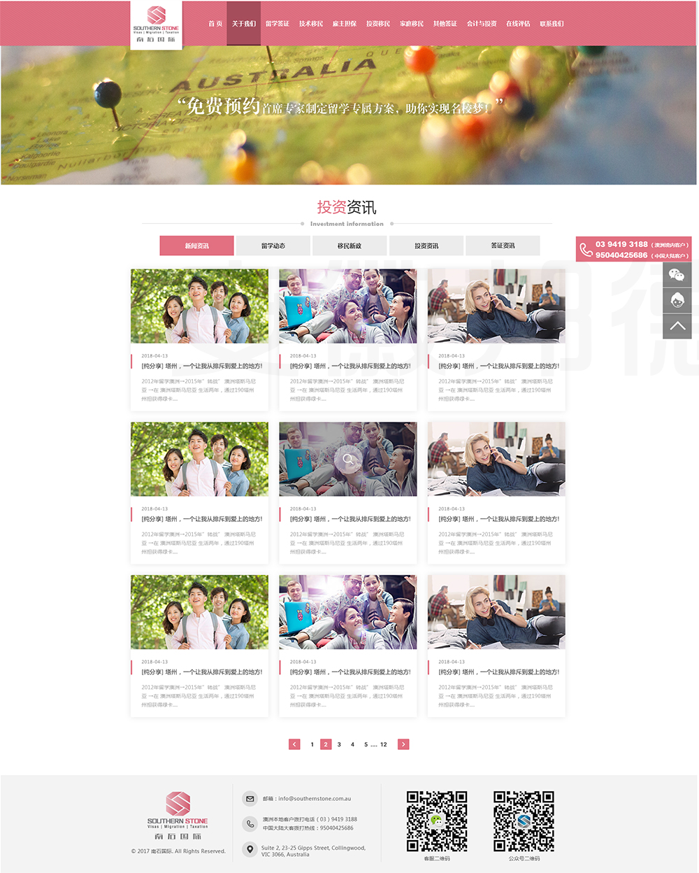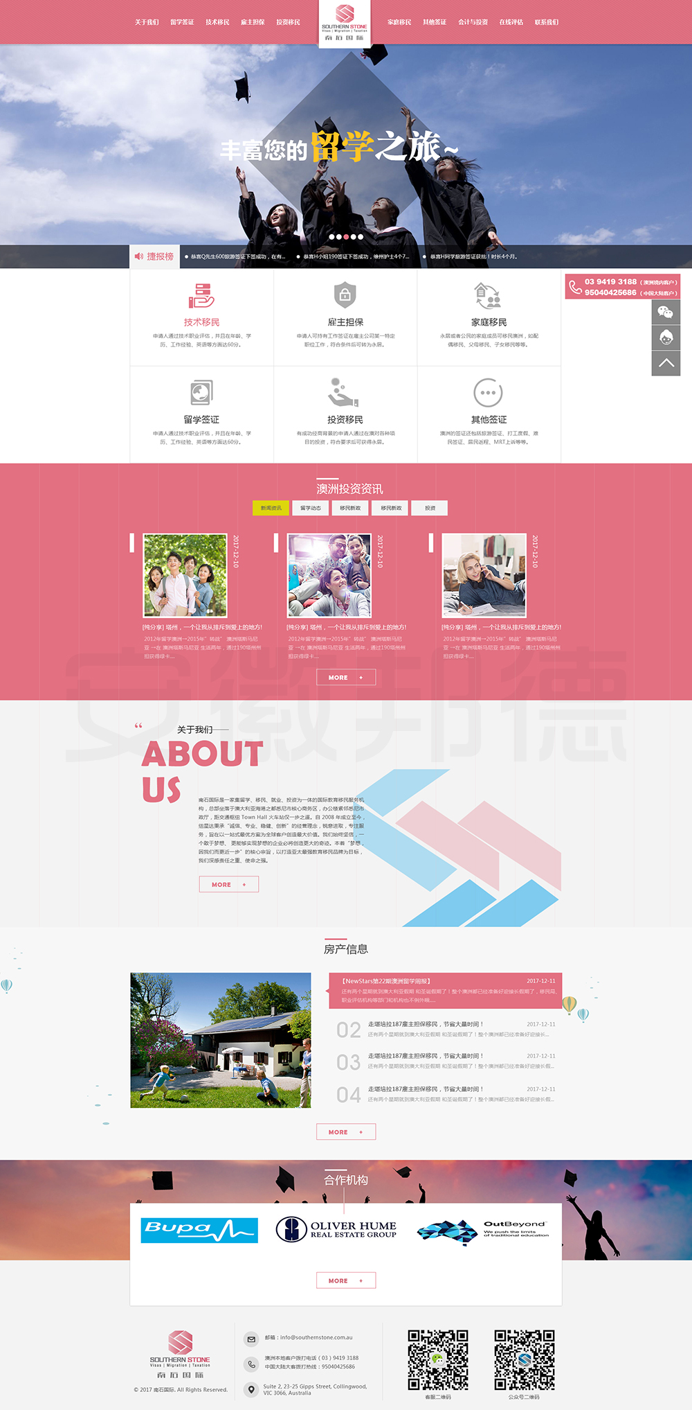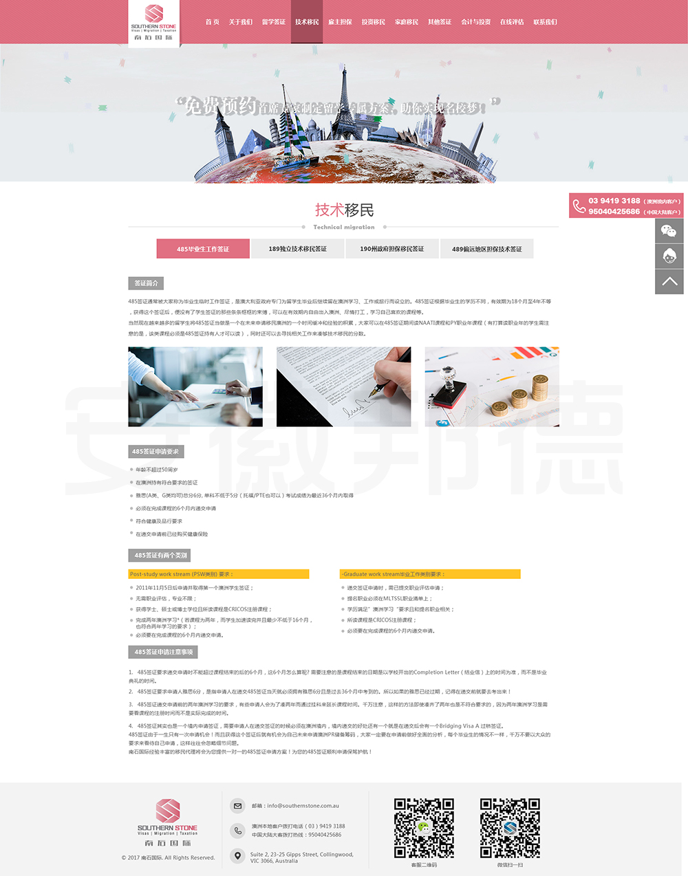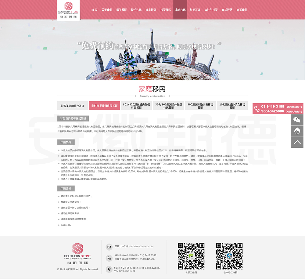 南石国际有限责任公司是一家经澳大利亚政府批准,在移民代理注册管理部门(OFFICE OF THE MARA)备案注册的移民咨询公司。我们的团队由专业的移民代理、留学教育代理、投资理财专家和从业经验丰富的员工组成。澳大利亚移民法条款繁多,内容复杂且瞬息万变;我们的团队严格遵守职业行为守则,时刻关注澳洲移民政策的最新动态,针对每一位客户的特点和要求量体裁衣,提供最便捷、最准备、最及时的签证和移民方案。邦德开发为客户提供网站效果图设计,