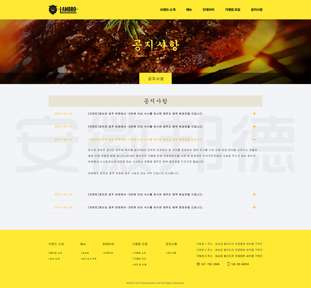 LAMBRO是韩国一家经营烤肉等韩国代表性食物的店铺。邦德开发为客户提供网站效果图设计, HTML5页面设计,程序开发和数据库开发,每位客户均按照需求提供定制设计开发,签订合同,分期付款,并提供完善的售后技术支持,第 一年免费送.com域名和10G(200M带宽)服务器空间。以下网站开发案例效果图我们为了防盗打了水印,网站开发案例均可提供网址和详细功能开发清单,详细内容可以咨询邦德开发客服人员微信!