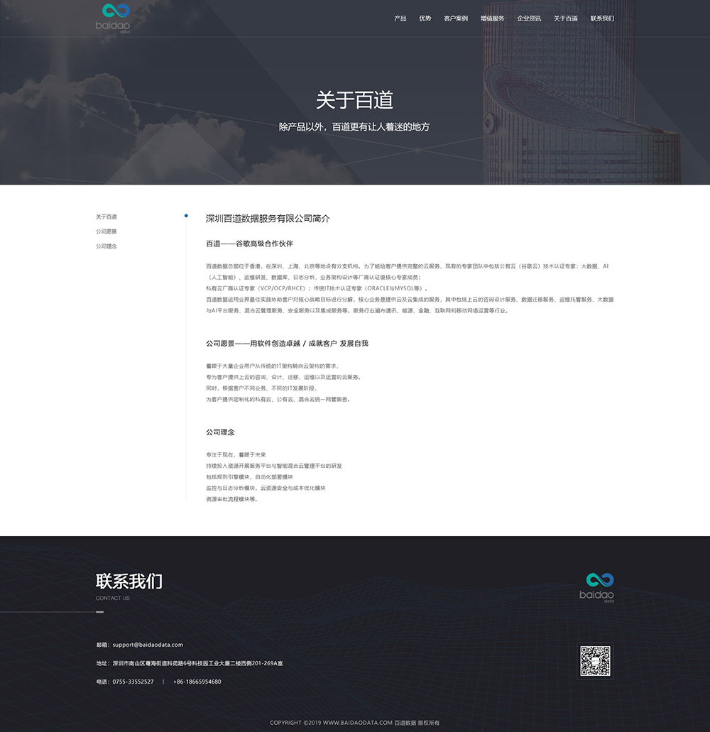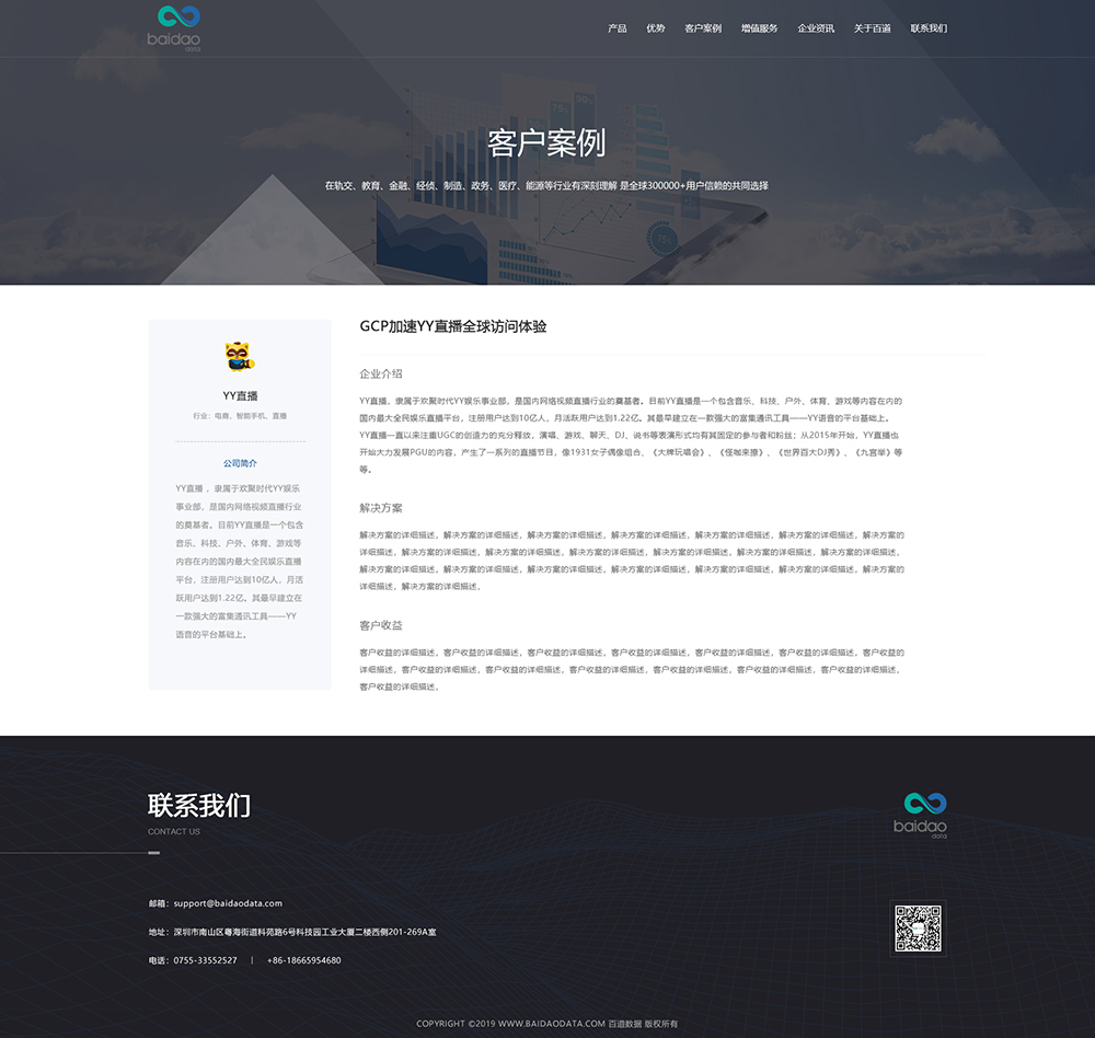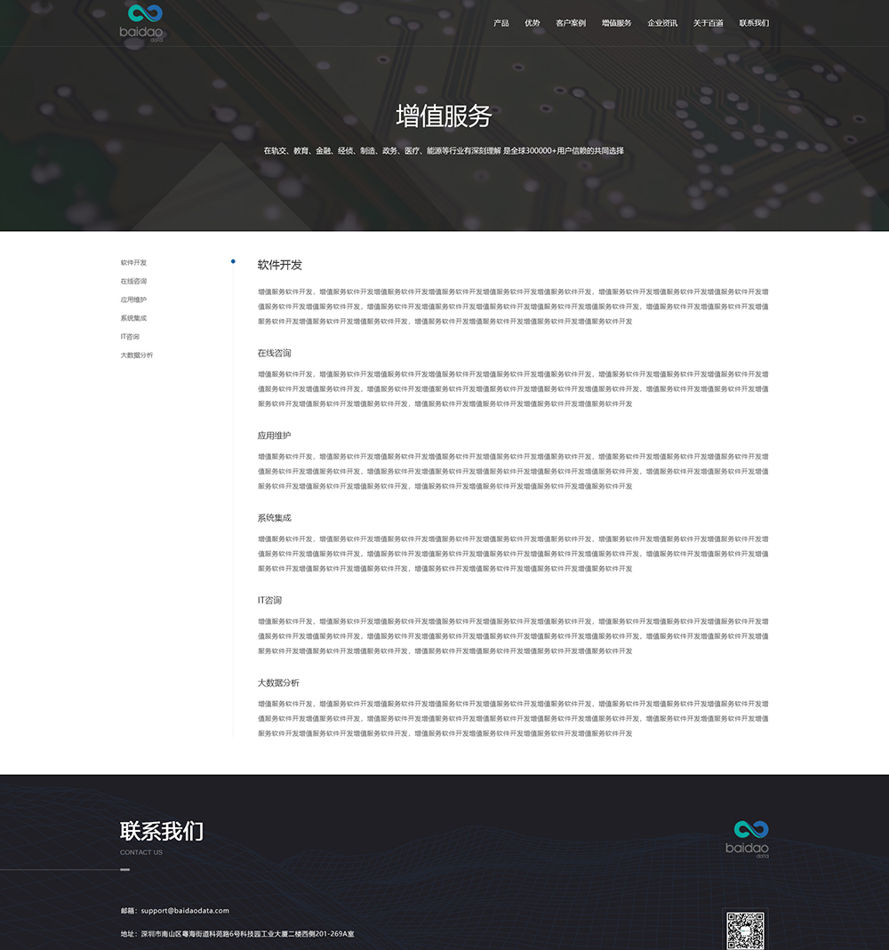百道数据总部位于香港,在深圳、上海、北京等地设有分支机构。为了能给客户提供完整的云服务,现有的专家团队中包括大数据、AI(人工智能)、运维研发、数据库、日志分析,业务架构设计等厂商认证级核心专家成员。邦德开发为客户提供网站效果图设计, HTML5页面设计,程序开发和数据库开发,每位客户均按照需求提供定制设计开发,签订合同,分期付款,并提供完善的售后技术支持,第 一年免费送.com域名和10G(200M带宽)服务器空间。以下网站开发案例效果图我们为了防盗打了水印,网站开发案例均可提供网址和详细功能开发清单,详细内容可以咨询邦德开发客服人员微信!