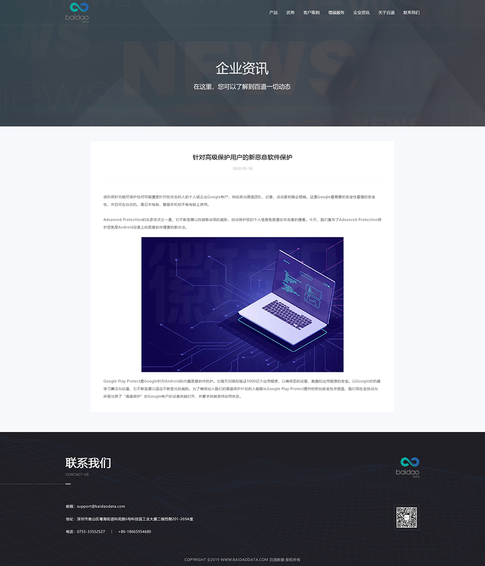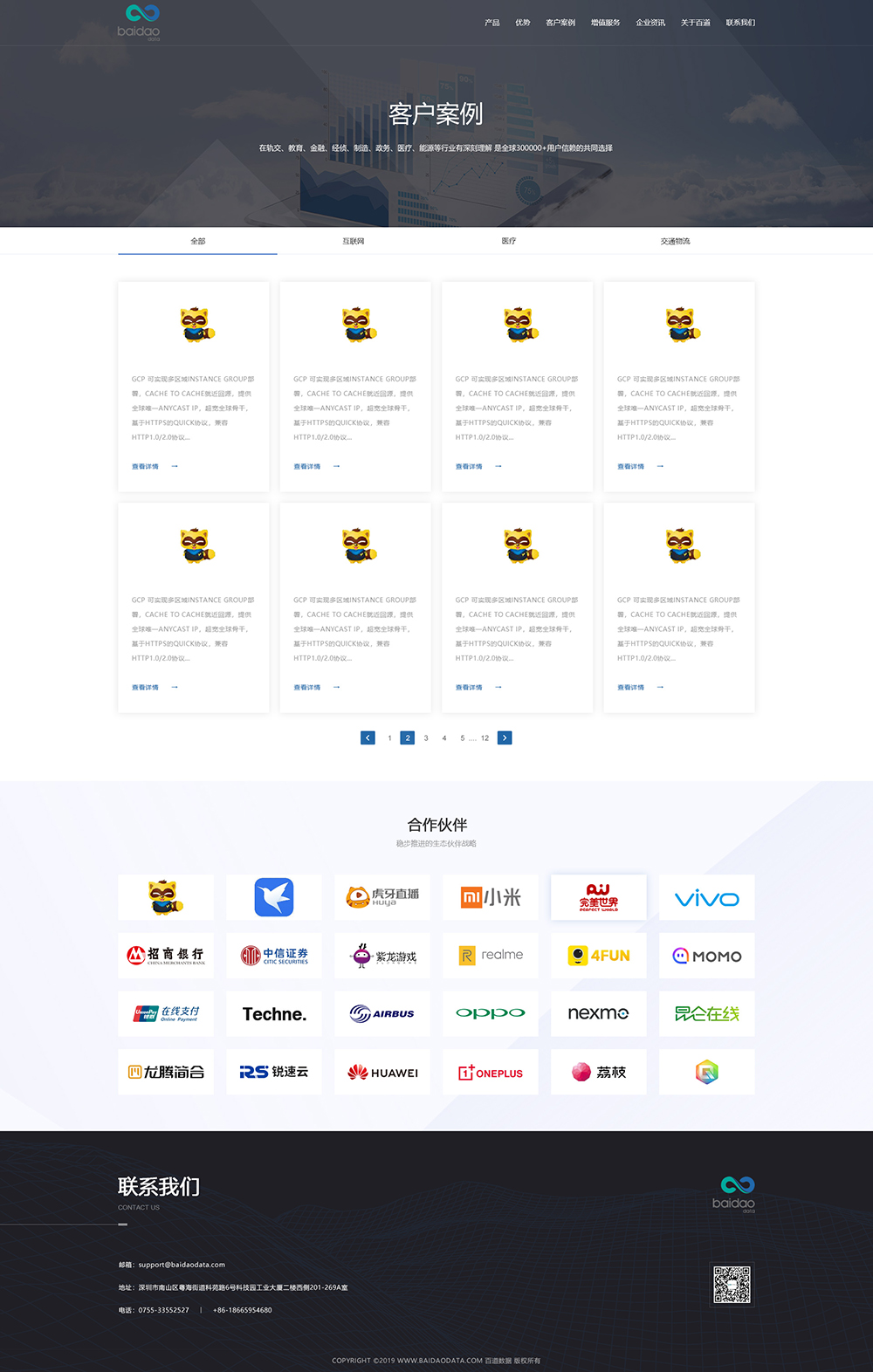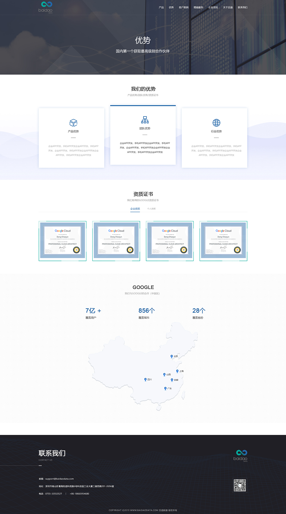 百道数据总部位于香港,在深圳、上海、北京等地设有分支机构。为了能给客户提供完整的云服务,现有的专家团队中包括大数据、AI(人工智能)、运维研发、数据库、日志分析,业务架构设计等厂商认证级核心专家成员。邦德开发为客户提供网站效果图设计, HTML5页面设计,程序开发和数据库开发,每位客户均按照需求提供定制设计开发,签订合同,分期付款,并提供完善的售后技术支持,第 一年免费送.com域名和10G(200M带宽)服务器空间。以下网站开发案例效果图我们为了防盗打了水印,网站开发案例均可提供网址和详细功能开发清单,详细内容可以咨询邦德开发客服人员微信!